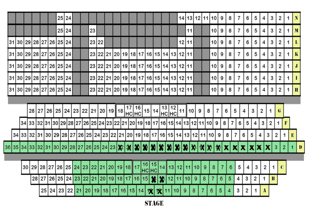 Seat map will be updated as tickets get sold. Green seats are available for purchase. Sold reserved seats marked with X. White seats are general admission.